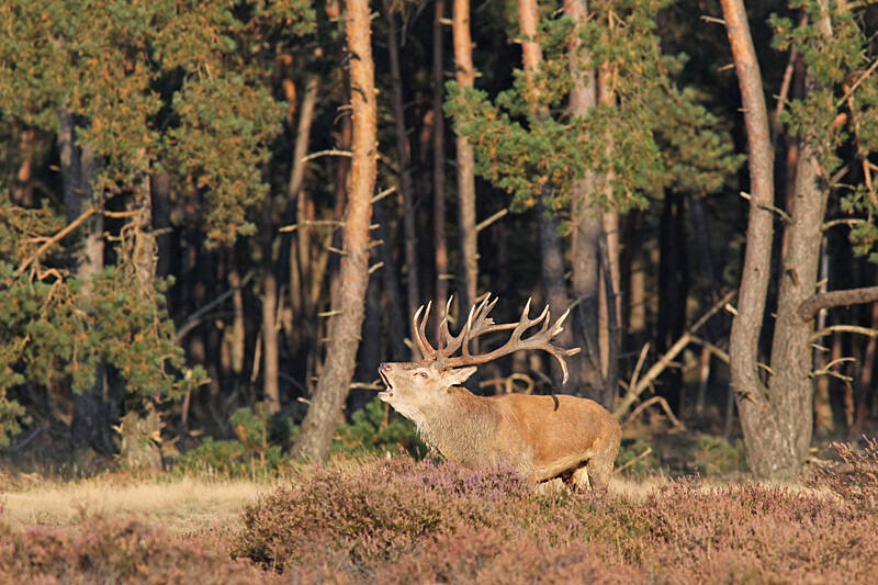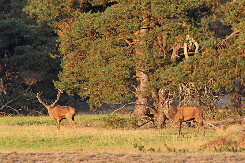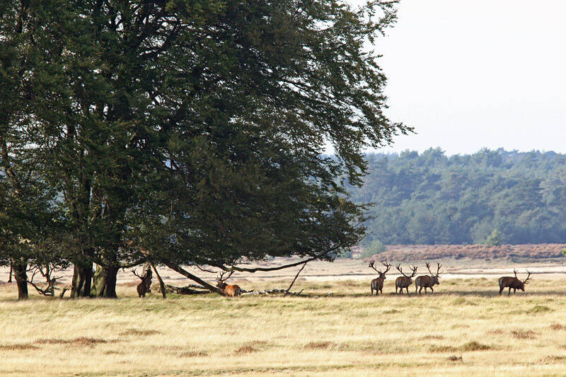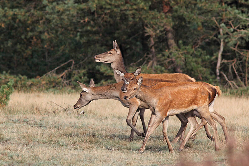 Een jong hert waagt zich af en toe een beetje uit de beschutting, maar het blijft oppassen, want die grote kanjers zijn toch een beetje