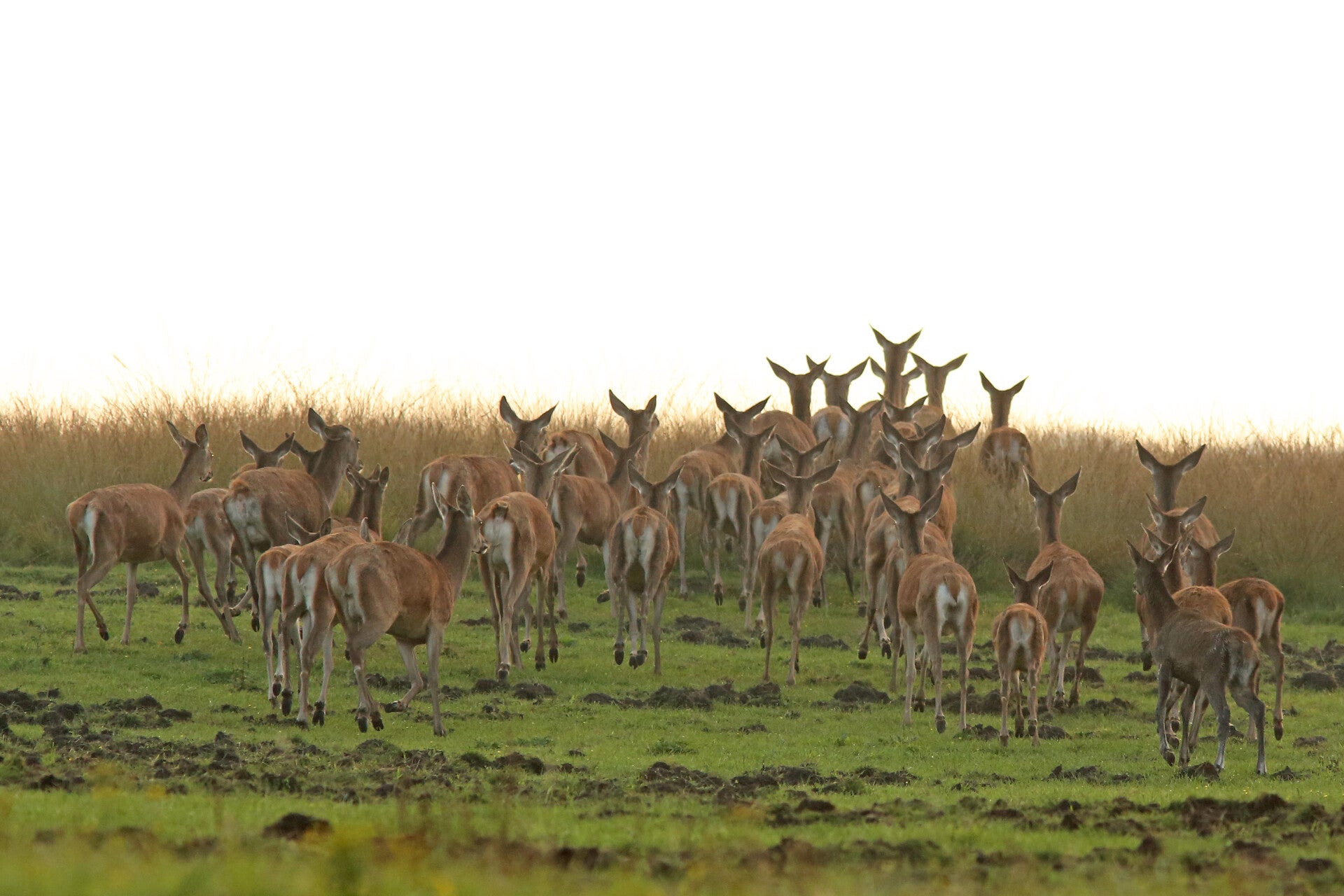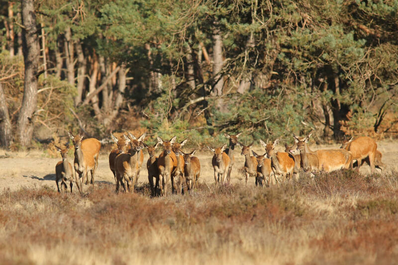 Hier greep een jong hert zijn kans om een deel van de roedel over te nemen. Zo te zien hadden de dames geen bezwaar.