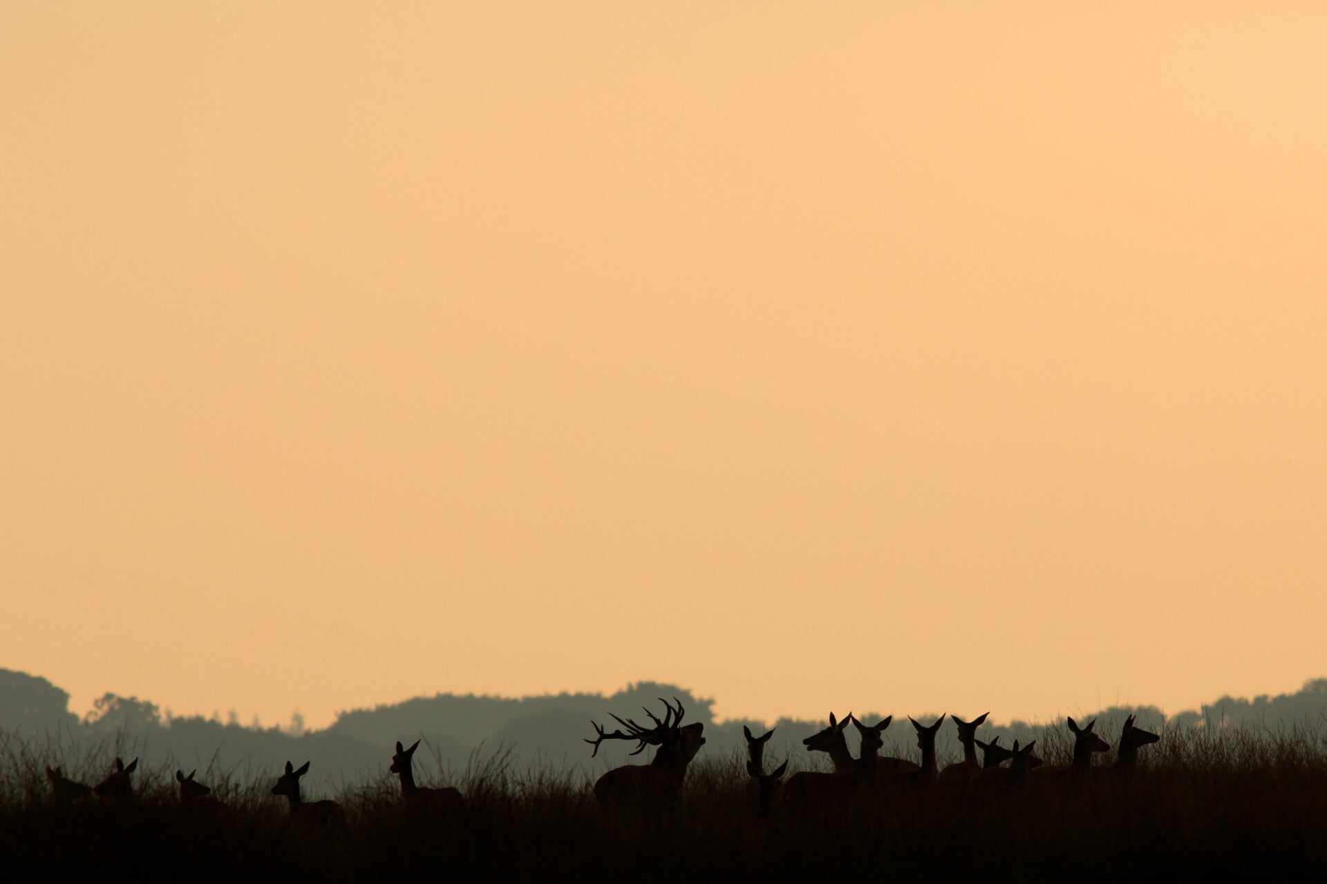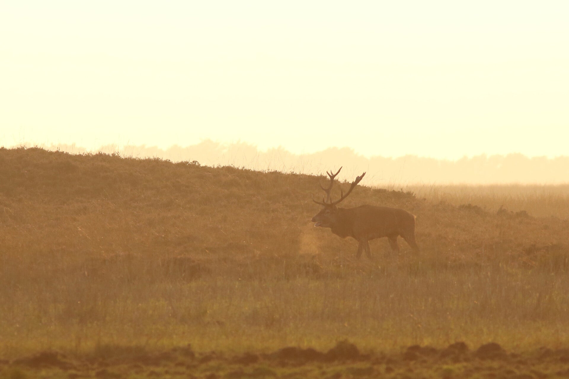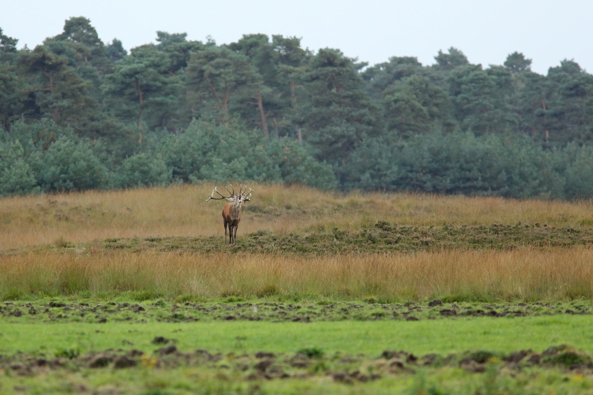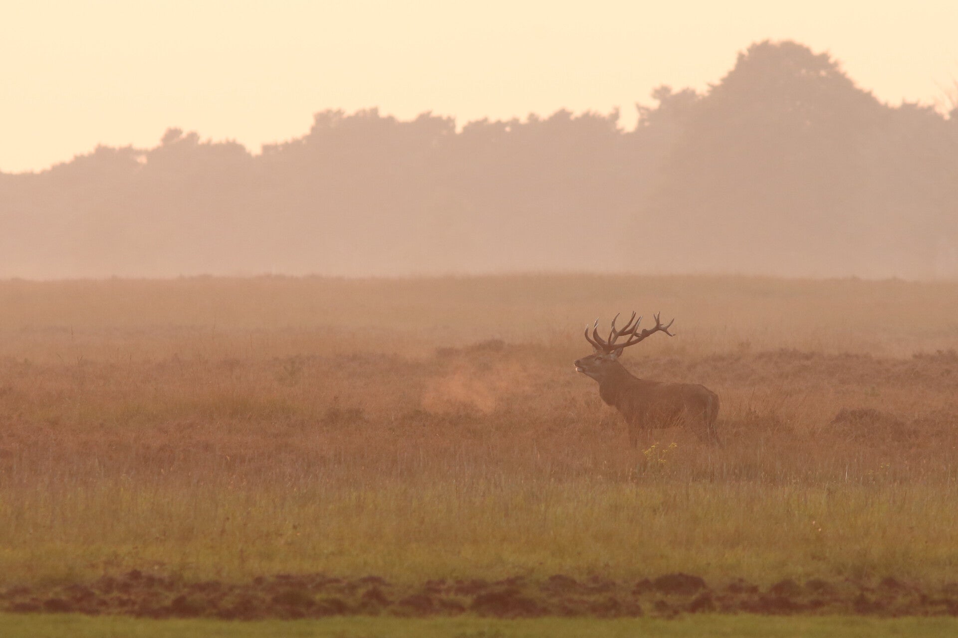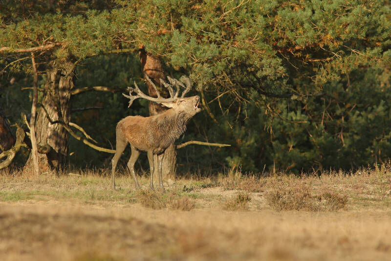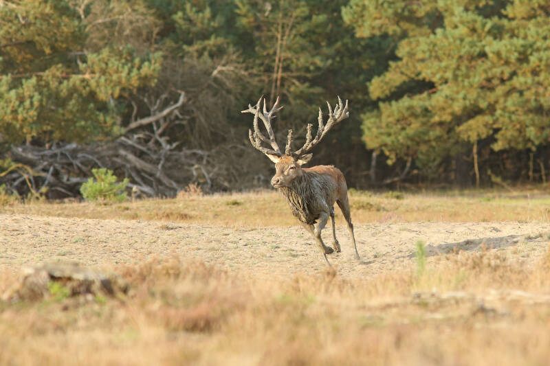 Bij een van de laatste zonsondergangen van de bronst mijmerde het hert, moe maar voldaan, voor zich uit ...