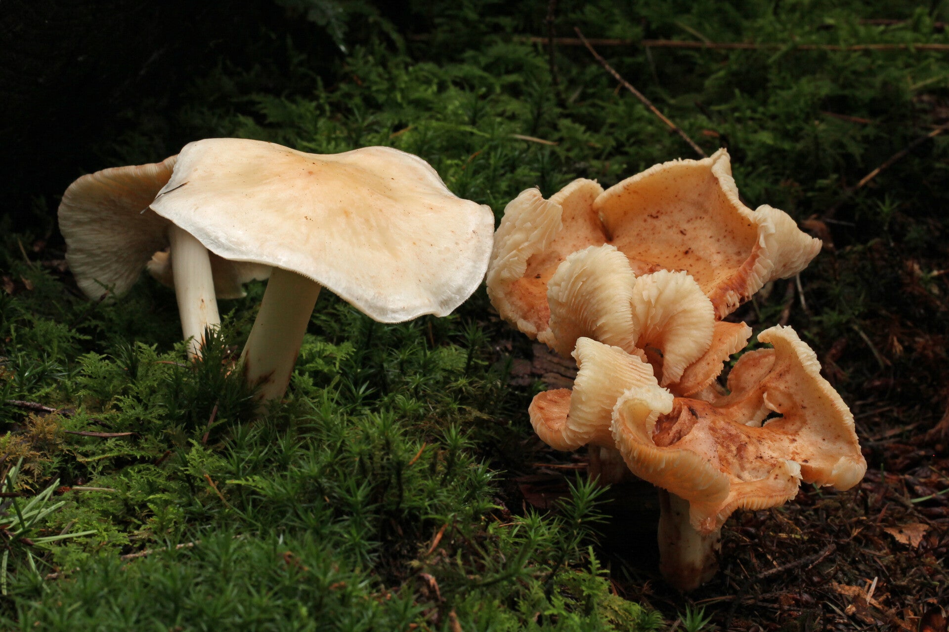 Links Stobbenzwammetjes en rechts Gewone Zwavelkoppen.