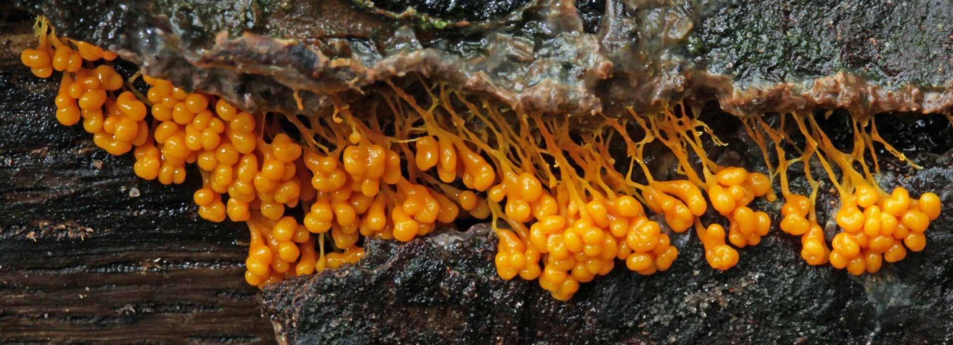De slijmzwamsporen ontwikkelen zich tot eencellige organismen en elke minuscule cel kan zich verplaatsen met een soort zweepstaartje. Die enkelingen versmelten zich tot een plastische massa (het plasmodium), zoals we hier zien. Wonderlijk is nu, dat ze gezamenlijk migreren. Om die versmolten massa vormen zich membranen. Door samentrekking van het membraan ontstaan er pulserende bewegingen en verplaatst-ie zich ... Dit is natuurlijk wat kort door de bocht, maar je kunt het je zo voorstellen.