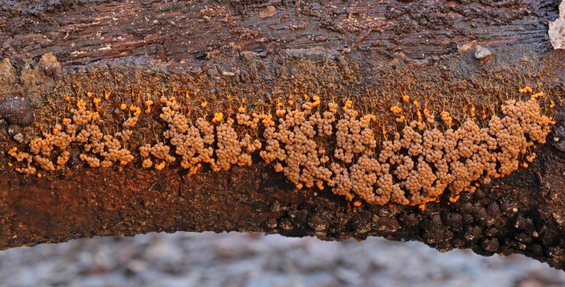 Als de slijmzwam voldoende bacteriën en plantenresten heeft verteerd kan er aan nakomelingen worden "gedacht". De massa verenigt zich dan en verstart. Dat is hier nu (5 dec.) het geval.