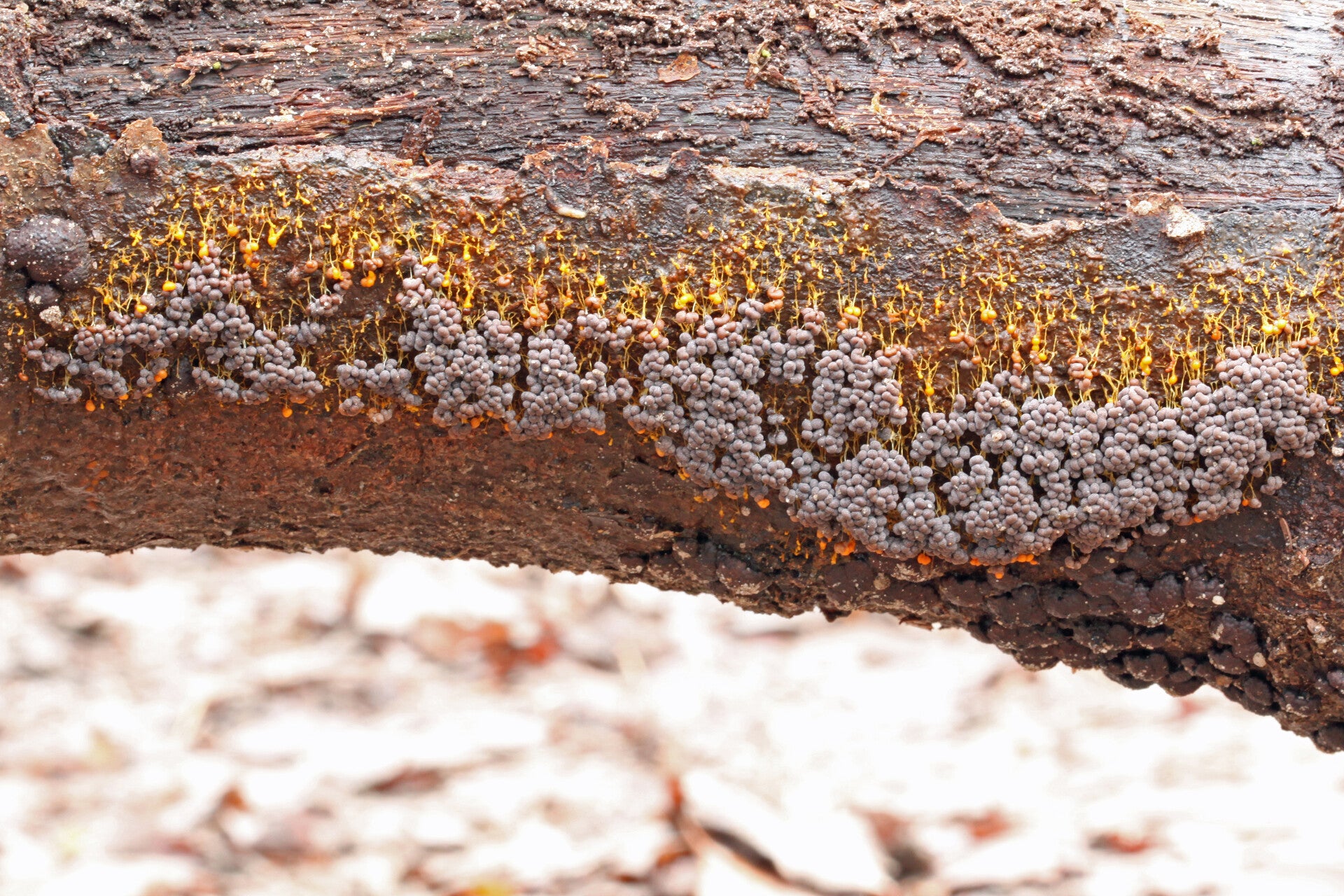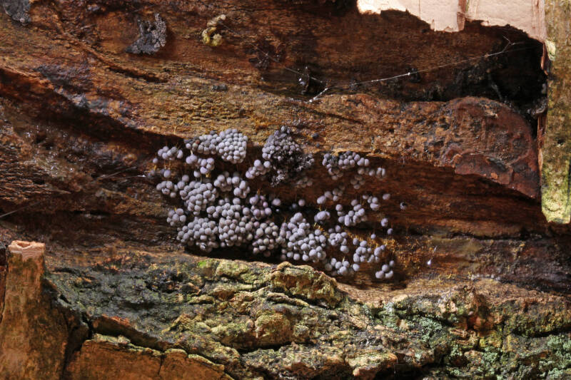 Blotebilletjeszwam Deze "billetjes" zijn transformaties uit een oranje of vermiljoen gekleurde geleiplak (plasmodium) en dat roze wordt na rijping zwartbruin, waarna ze open barsten en de sporen vrijkomen. De officiële naam is Gewone Boomwrat of Bloedweizwam.