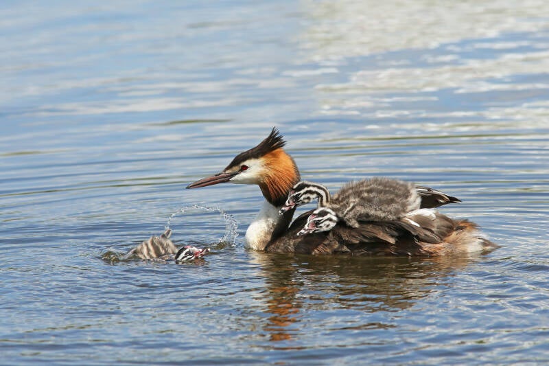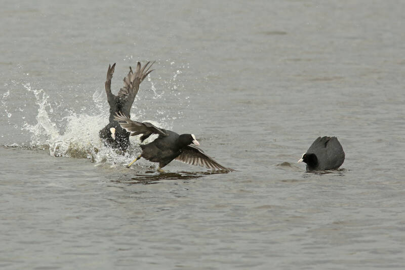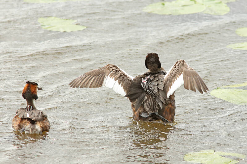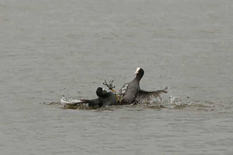 EN BLAZEN ZE, ALS ZE GESTOORD WORDEN BIJ HET BROEDEN, VOORAL ALS ER EEN MEERKOET TE DICHTBIJ KOMT ...