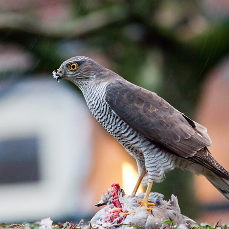 Eind november was het, toen de achterburen me waarschuwden dat er een roofvogel zijn winterreserve, bij hen aan het aanvullen was. Het bleek een Sperwer (v) te zijn, die een Turkse Tortel te grazen had genomen. Het schemerde en het miezerde, kortom ongewenste griebelgrauw ... Dan moet je alle registers van je camera opentrekken voor een geslaagde plaatjespoging.