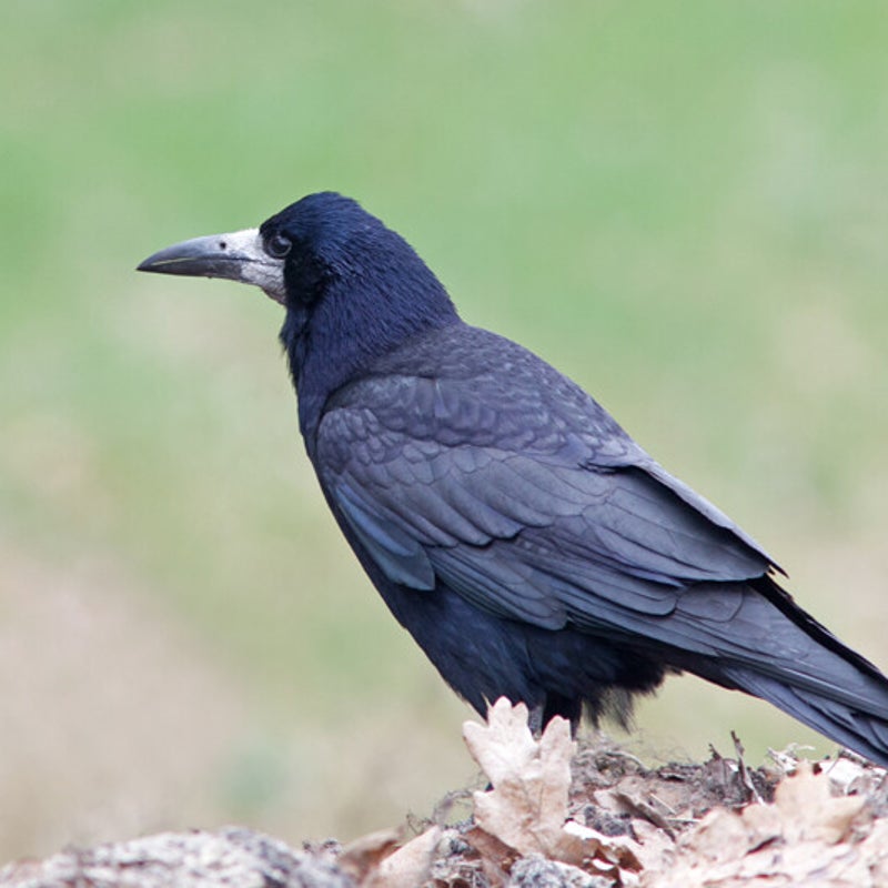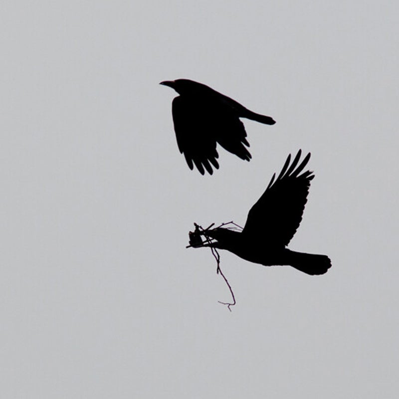 Vaak wordt een Roek met nestmateriaal, geëscorteerd.